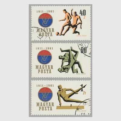 ハンガリーの名門スポーツクラブ「VASAS」の創立50周年の記念発行。各種競技を象徴的なシルエットで描き、動きの美を簡潔な線で表現。力強さの中にリズムと均整があり、スポーツを芸術として捉えた洗練されたデザインです。