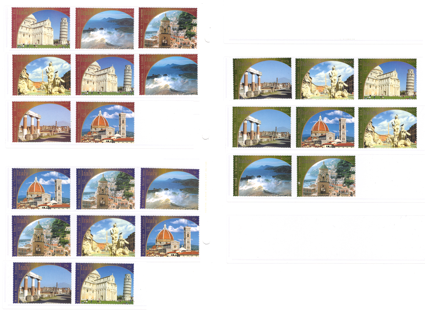 国連本部、ウィーン、ジュネーブ各支部で発行された単片と切手帳切手のセットです。発行元、額面違いの6図案24種です。 フィレンチェ、アマルフィ海岸、エオリア諸島、ローマ、ピサの斜塔、ポンペイ