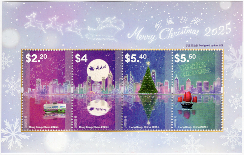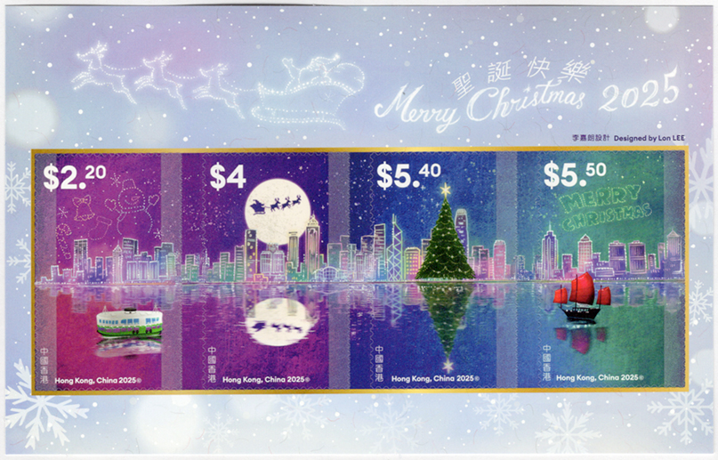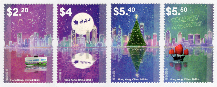 ビクトリア・ハーバーの夜景を背景に、サンタのそりやツリー、帆船がきらり。大都会の港が一夜だけ夢の港になる、ロマンチックなクリスマス切手です。