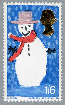 イギリスで最初に発行されたクリスマス切手2種の内の1枚です。ハットがおしゃれな雪だるまです。燐線入りの商品です。