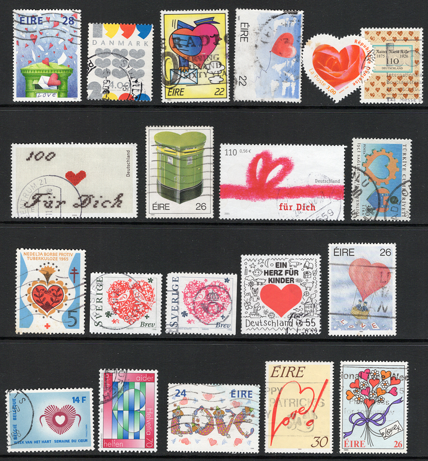バレンタイン切手やデザインにハートが入っている使用済み切手20種です。若干のシミのあるものが含まれます。コンパクトにまとめてお送りします。