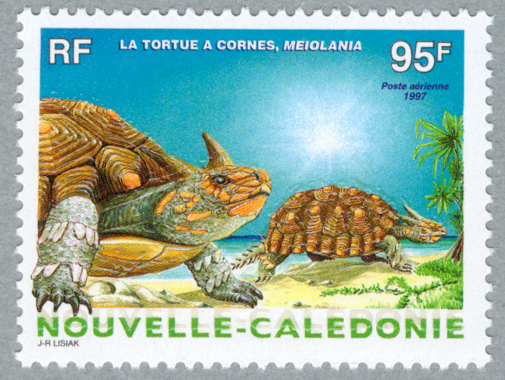 太古の昔にオーストラリアやニュージーランドに生息していた陸生のカメです。切手の表面にはサーモグラフィーを使って施された凹凸があります。